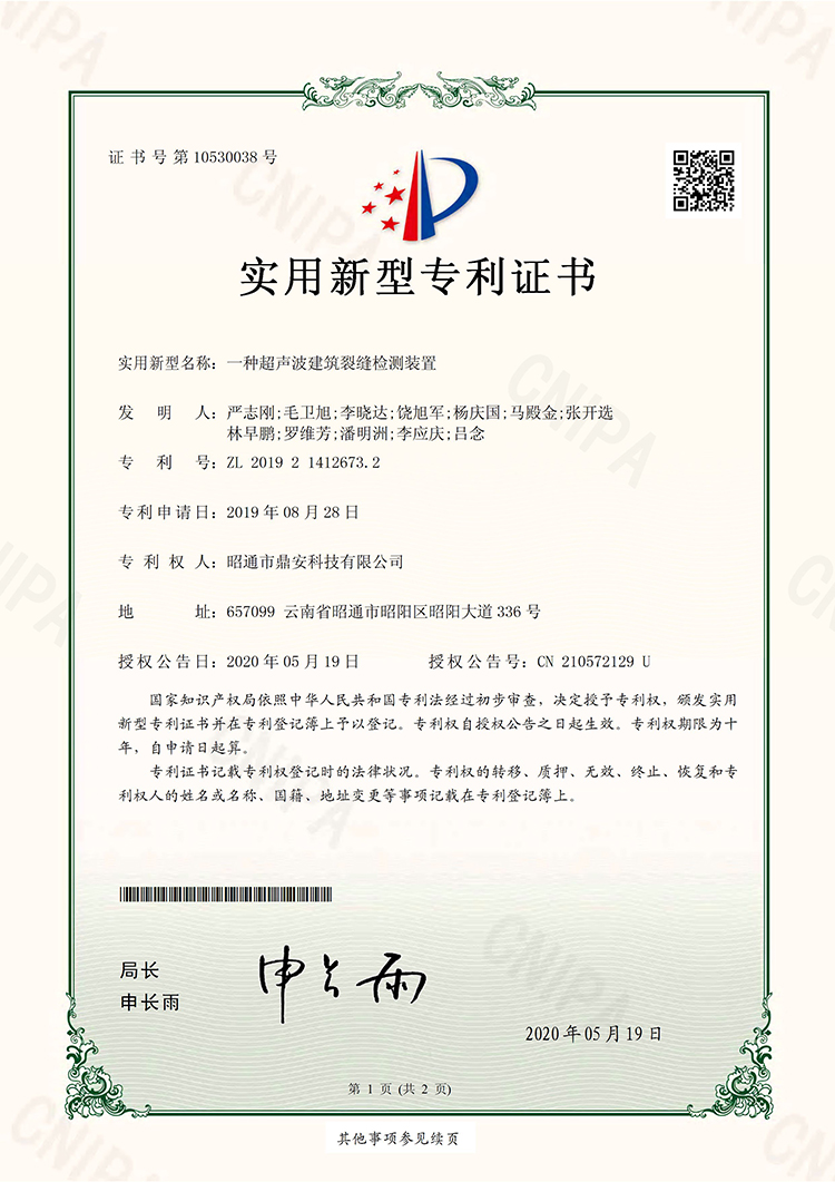 10530038一種超聲波建筑裂縫檢測裝置20200519實用新型專利證書